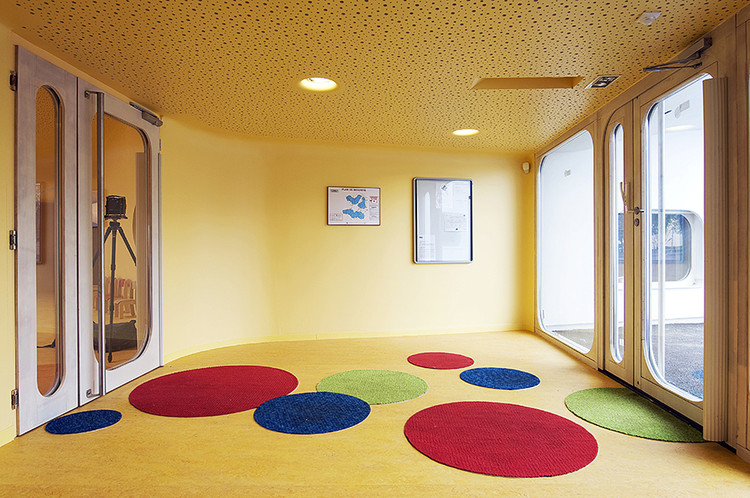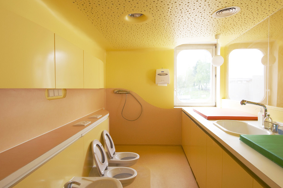 此外雨水管位于建筑側面,這樣家長們永遠不用抱起孩子跨過水溝。內部空間的組織都圍繞著高度安全的圓形中央空間,孩子們的空間圍繞并匯聚于此。每個相鄰的空間都彼此連通便于相互照料,最大程度的保證了安全。中心帷幕似的木結構最高處是3米寬的聚碳酸酯拱形天花板,保證室內全天都沐浴在充足的陽光之下。幼兒園設計