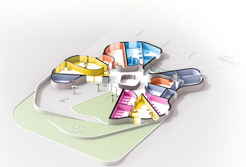 關于保育設施的設計,它是朝南的方位,這給了我們與環境的無縫集成的設想創造了一個平臺,我們的想法是讓這個結構自然傾斜。每個平臺對應像花園,游樂場,教育花園等功能...設施的造型體現了建筑的風格,這簡直就像是是其它教育機構所包圍的局面。我們的建筑物具有既不是“主立面”,也不是“背立面”的特點,但作為一個整體,只有一個邊緣,它只有一個美學上均勻的外觀,其可以從周圍可見。