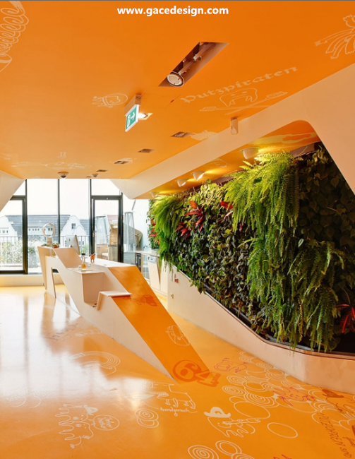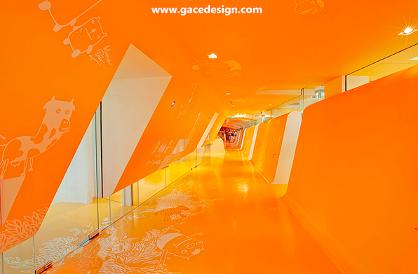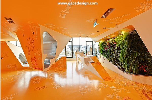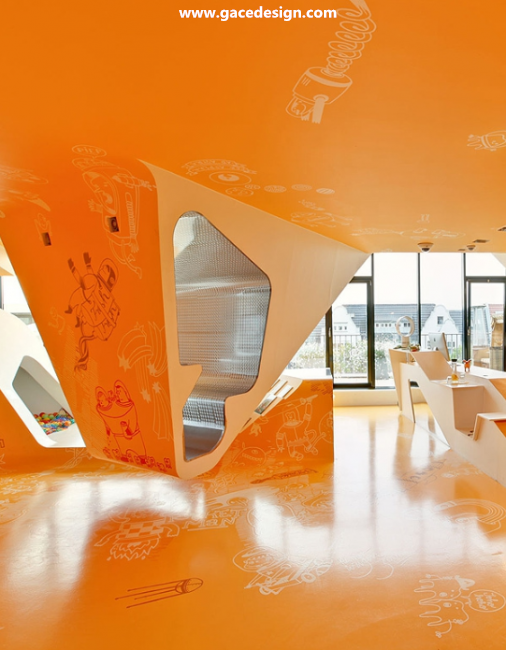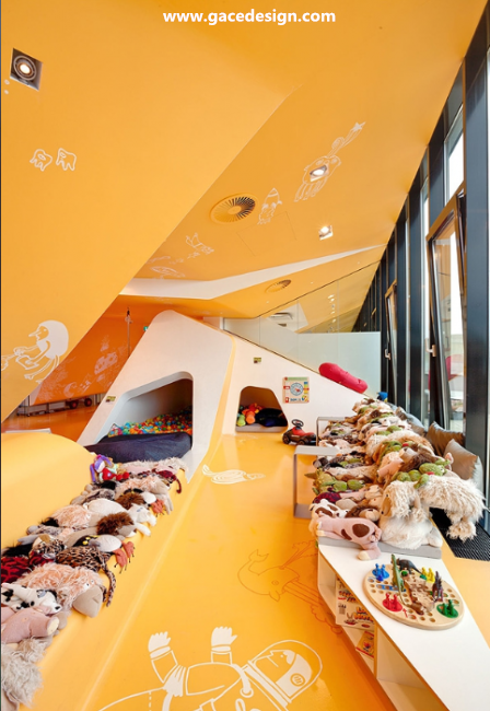 整個(gè)KU65 Kids Club的內(nèi)部顏色選用來鮮亮的橙黃色與白色搭配,所有被“切開”的斷面皆為白色。桔黃色的表面上印有各種有趣的卡通圖案與涂鴉,甚至還有類似攀巖的墻壁。很難想象這里竟是一家醫(yī)療保健機(jī)構(gòu),所以項(xiàng)目名為KU65 Kids Club就容易理解了。幼兒園設(shè)計(jì)