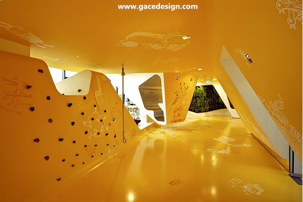 KU65兒童俱樂部位于德國。該項(xiàng)目打破了傳統(tǒng)空間概念,創(chuàng)作出了非常豐富而有趣的室內(nèi)空間。建筑內(nèi)部的地板,墻面和天花板甚至包括家具完全融為一體,仿佛一個(gè)有機(jī)體的內(nèi)部。豐富的造型激發(fā)著來這里的孩子們的想象力與好奇心,天花板上懸吊下來的空間造型是可參與的,可爬可坐,或者做游戲,總之到處充滿了獨(dú)特的空間體會,讓他們很容易便忘記了即將到來的牙科醫(yī)生。