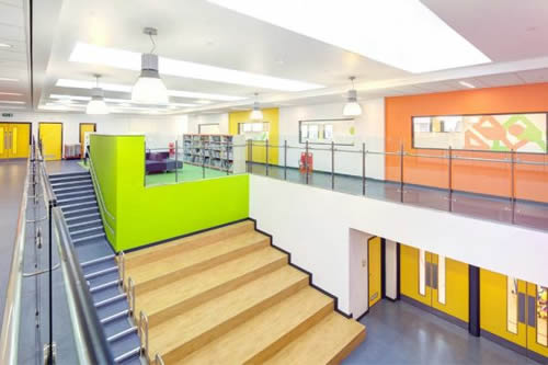 這座建筑的室內(nèi)設(shè)計是在保持教室原貌且敏感地利用室外光線的基礎(chǔ)上設(shè)計的,室內(nèi)有更好的視野,有直接的外部通道,并與建筑中央的廣場相連。中央廣場是一個兩層高的空間,可提供眾多獨特的學(xué)習(xí)環(huán)境和小教室。這個中央交通流線空間避免了走廊的設(shè)計,每間教室都通過大型玻璃墻與這個廣場相連。廣場的學(xué)習(xí)環(huán)境是建筑師與學(xué)校、甲方團隊共同設(shè)計的,目的是保證空間的多樣性——從私密的小組學(xué)習(xí)室到階梯表演空間。這些經(jīng)過仔細考慮的學(xué)習(xí)空間借用交通流線空間,創(chuàng)造了額外的學(xué)習(xí)機會,反映了Park Brow社區(qū)小學(xué)的教學(xué)風(fēng)氣。