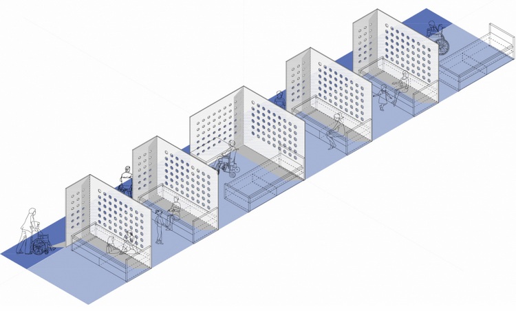 睡眠空間包含兩部分,一是隱藏空間,一是“凹處”。“隱匿處”的穿孔木制面板創造了獨立而且光學連續性良好的房間,而在“凹處”靠床一面的墻壁則被加厚,床深深嵌入環繞它的墻壁里,保證了在公共房間內的隱私。