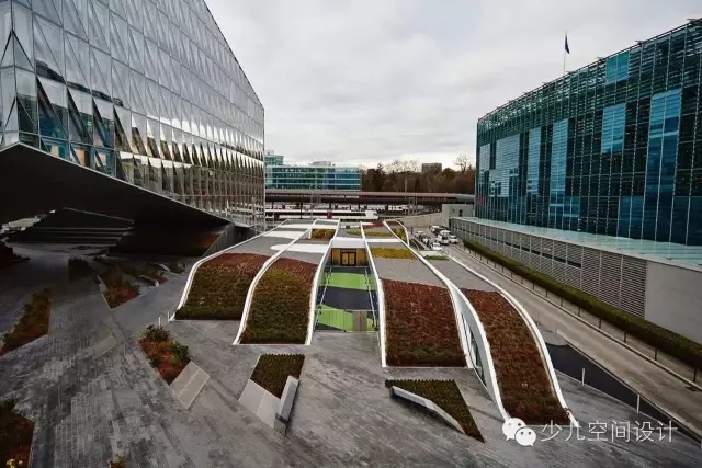 這片兒童區(qū)域與日本國際煙草公司日內(nèi)瓦分部相連。位于日本國際煙草公司與世界氣象組織這兩個(gè)大體量構(gòu)筑物之間的幼兒園,被定位為具有功能的景觀建筑。