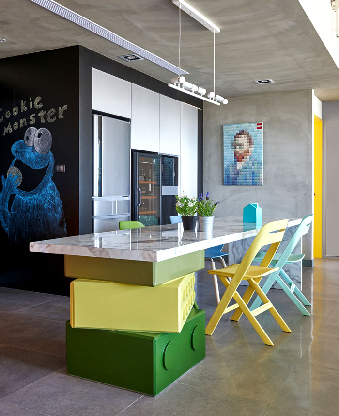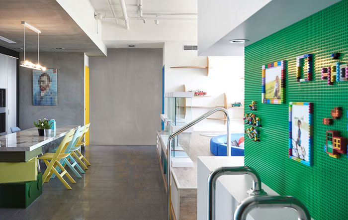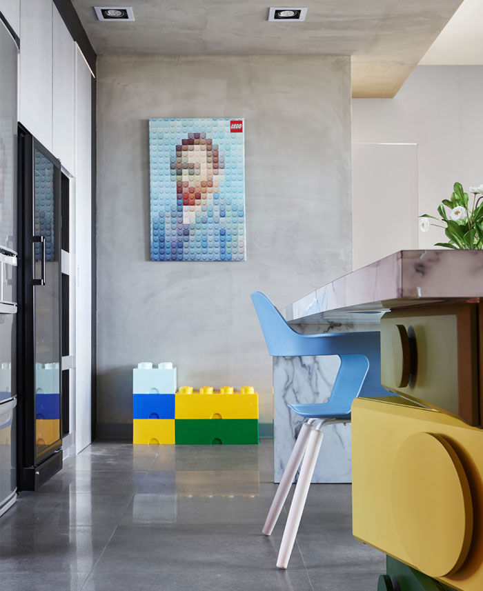 在任一角落似乎都能捕捉到樂(lè)高元素,臺(tái)階,展示柜,餐桌甚至是墻上的掛畫(huà)都被打上了標(biāo)簽,不同色彩的積木條不僅增添趣味性還讓整個(gè)空間變得豐富起來(lái)。