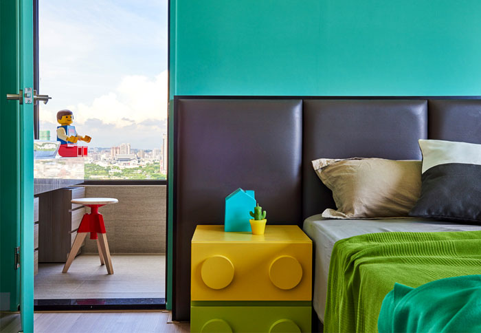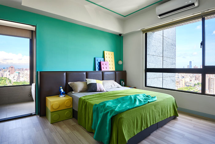 藍(lán)色,綠色,黃色,臥室的色彩十分的跳躍,必不可少的樂(lè)高元素讓臥室起來(lái)就像是玩具中的空間,利用大窗戶(hù)帶來(lái)的良好采光,降低鮮艷色彩帶來(lái)的視覺(jué)疲勞,這樣一個(gè)充滿(mǎn)童趣的空間也拉近了父母與孩子的距離。