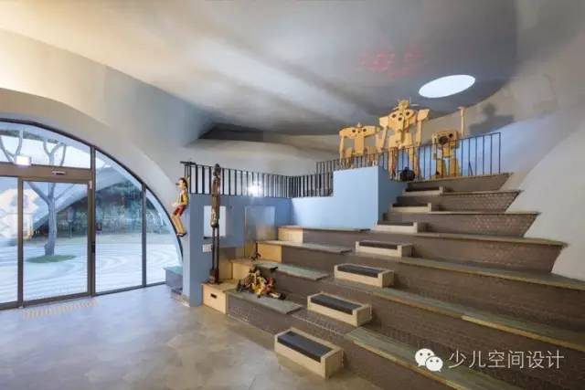第一棟樓(波浪與鯨魚)試圖表達一種受匹諾曹故事啟發的空間,大風暴和鯨魚等主題都進行了表現。平面布局采用了曲線,讓人想到子宮內蜷曲的胎兒。平面之后演變成了鯨魚與波浪的結合,最終融為一體。大臺階與小臺階營造的座椅間營造的狹長扭曲空間試圖增強空間的游戲性與冒險感。不幸的是,這里暫時關閉。被建筑圍合起來的不封頂的凹坑狀空間在天氣好時可以作為室內空間的延伸。由于所有的窗戶可以折疊和推到兩側,許多室內的概念與設計都可以被盡可能地實現,但是出于內容與安全考慮只有中間區域可以安置這樣的內容。