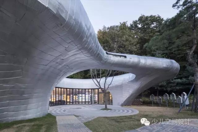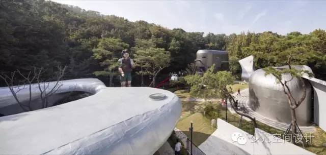 第三棟樓(鼻子噴泉)臨近水池與天空列車。光潔的鼻子是提供了聲音與動感的噴泉,讓這個寧靜的環境頓時有了生氣。這里的形式呼應了整體的曲線性基調,窗戶也呼應了整天,但是你若是仔細觀察你會發現摩爾斯電碼。你會嘗試解讀它們,說不定也能猜出一些簡單內容。二層的陽臺向兩側敞開,貫通森林的視線映入眼簾。視線與空間的聯系恰恰是整棟樓設計的首要考慮因素。在2層的咖啡廳,你不僅可以看到內院,還能坐擁面對其他兩棟樓的極佳視野。