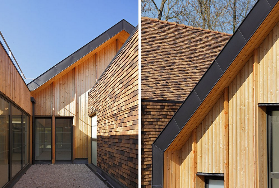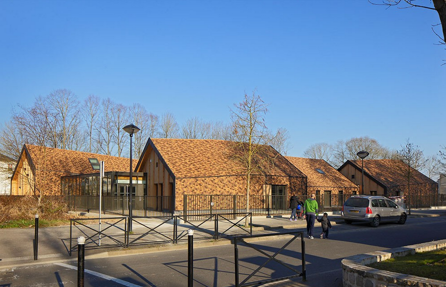 一座位于巴黎利耶于桑的幼兒園,設(shè)計(jì)師設(shè)計(jì)了大地色的陶瓷磚陶瓷磚的重疊像鵝卵石一樣覆蓋在獨(dú)特的坡屋頂建筑表面,裝點(diǎn)著幼兒園。覆蓋了整個(gè)幼兒園的屋頂和墻壁,遠(yuǎn)遠(yuǎn)看去就像是聚集在一起長(zhǎng)滿(mǎn)鱗片的建筑群。