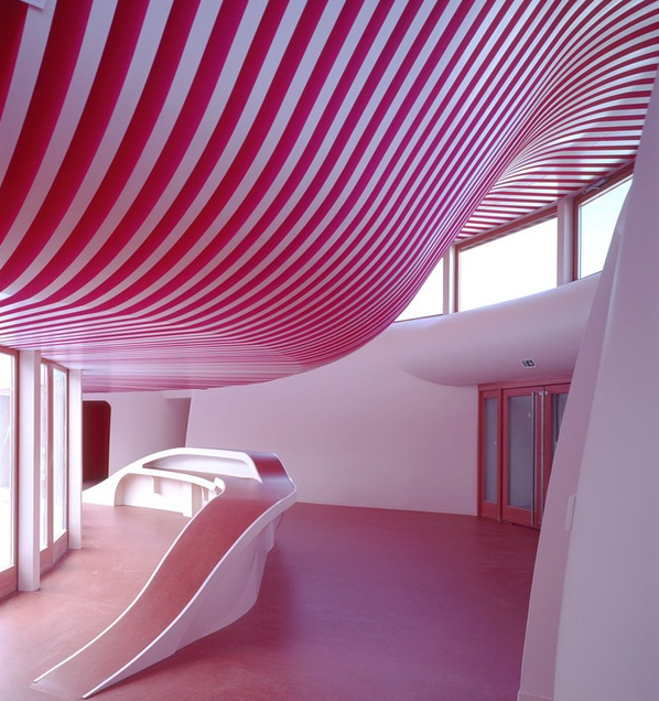 在這個(gè)建筑的屋頂和墻面甚至是家具的處理上都采用了波浪弧線的形式,因?yàn)檫@樣的設(shè)計(jì)可以讓讓室內(nèi)的空間充滿想象與童趣,同時(shí)也在許多屋頂設(shè)置了天窗,通過(guò)天窗可以讓自然的光線射入室內(nèi),幼兒園室內(nèi)設(shè)計(jì)采用的是粉色主題,在不同的角度的天窗照射進(jìn)來(lái)的陽(yáng)光也是多樣化,陽(yáng)光和粉色裝飾相結(jié)合室內(nèi)也更加的溫馨明亮,自然采光的室內(nèi)不管是在哪個(gè)區(qū)域角度去看都充滿了新意和童趣。