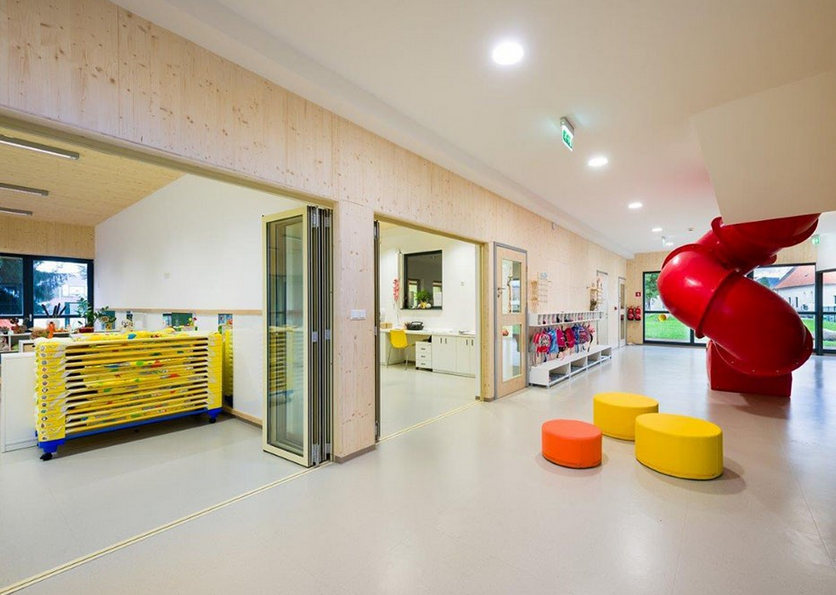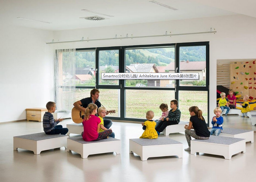 斯洛文尼亞的?martno分時幼兒園是低能耗房屋。幼兒園室內(nèi)設(shè)計的是采用木材裝飾,所有墻面的木材都是當(dāng)?shù)厝〔模@也確保了可持續(xù)建筑的最高標(biāo)準(zhǔn)。建筑十分緊湊,所有的建設(shè)工作包含操場,都僅在四個月內(nèi)完成,北向幾乎沒有開口,南立面則全部對外開放。