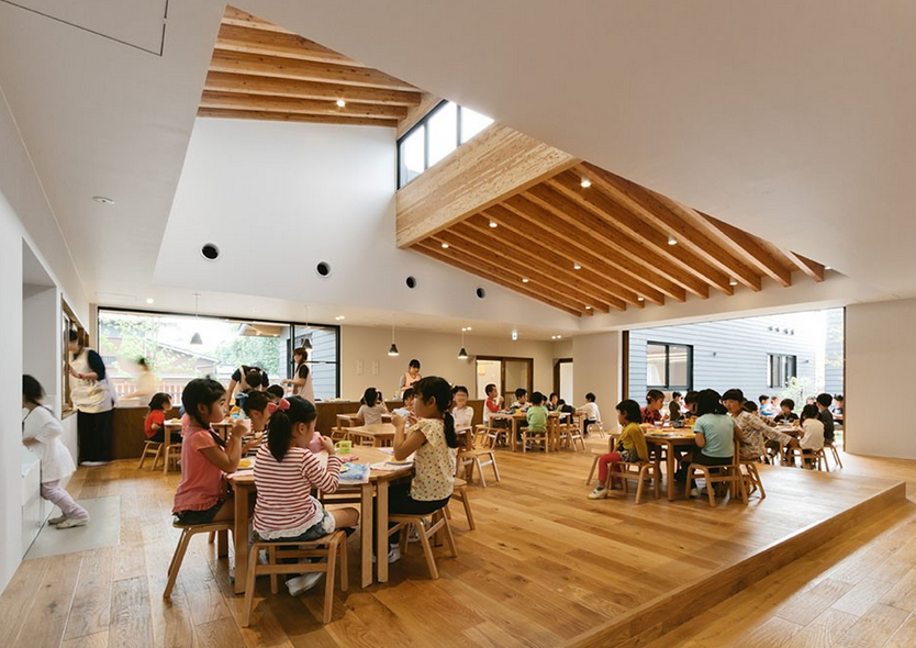 屋頂相互連接,并按照方向和功能劃分等級。它通過產生不同高度的天花板提供了上下不一的內部空間,并吸引孩子們的好奇心。值得注意的是餐廳。在餐廳,舒適的風從與屋頂連接的高側窗吹過,產生一個舒適、明亮的空間。