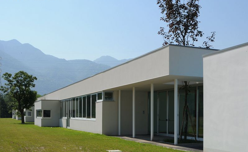內部的走廊看起來就像是電影里面的鏡頭。在入口后面,裝有玻璃的明亮處,有著一條隱蔽的走廊能通往不同的教室,它們的入口光線都是從高處照下來的。面對花園的走廊都裝上了玻璃窗,從這里往外看,可以看見精神運動性教室以及它外部的形狀、歷史中心的全景輪廓。