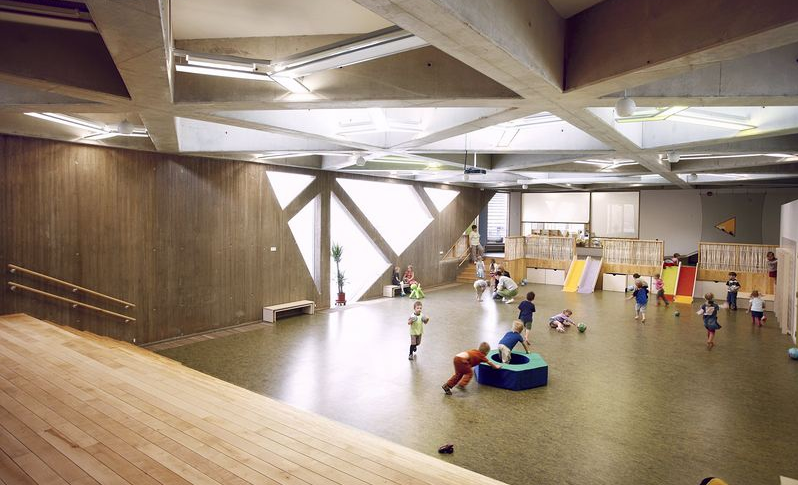 幼兒園設計的構造非常頭特色,六個花瓣里面包含了幼兒園家庭房間、創意教室、廚房、餐廳和行政辦公室。這個星形的建筑使得室內采光充足,親密的庭院之間形成翅膀。就像是花朵一樣的結構構造了幼兒園內部院子相連的華麗格局,設計師為了更好的利用院子,幼兒園的北面基地和街道做出了明顯的界限,有著才是玻璃做成小窗戶的混凝土的墻面,還有和幼兒園奇齊平的竹子柵欄把幼兒園和外界相隔開來。
