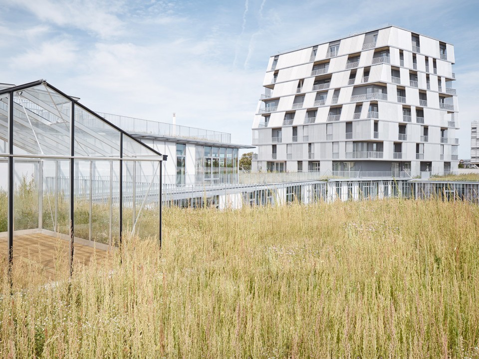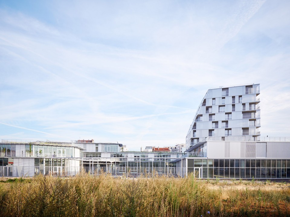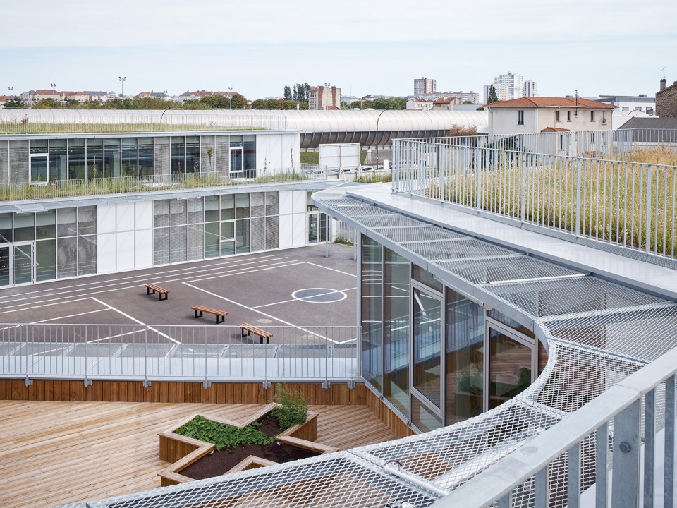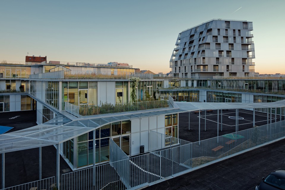 學生宿舍的設計基于4個主要建筑學原則。首先,項目作為一個整體要具有合理的功能(結構和技術空間的疊加),同時還要緊湊。距離其他功能分區的距離使它有所脫節,具有一定的獨立性。由于宿舍區被設置在盡可能北的方位,最窄的立面朝向Jean-Jaurès大街,平臺不會阻擋陽光進入室內。這也保證了操場能夠享受足夠多的陽光。