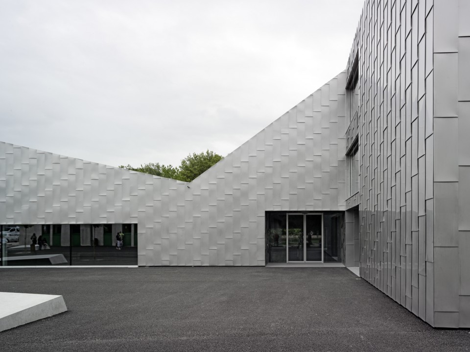 整個(gè)建筑的山墻朝向南北,與城市肌理相契合。承重墻、樓板與立面組成承重系統(tǒng)以鋼筋混凝土構(gòu)筑而成,以求達(dá)到當(dāng)?shù)叵嚓P(guān)部門(mén)對(duì)抗震的要求。屋頂結(jié)構(gòu)的兩重結(jié)構(gòu)皆有木材制成,而外層則覆蓋著金屬薄片,而類(lèi)似的,建筑的立面也由魚(yú)鱗般的金屬般構(gòu)成。遠(yuǎn)遠(yuǎn)看去,建筑仿佛呼應(yīng)著周?chē)娜荷?,錯(cuò)落起伏。相互穿插的方形體量組合出疏密有致的空間,而高低起伏的屋頂從東向西延伸。新建的學(xué)?;顒?dòng)中心延續(xù)了校園現(xiàn)有的空間秩序,同時(shí)也與周邊的傳統(tǒng)建筑形式遙相呼應(yīng)。