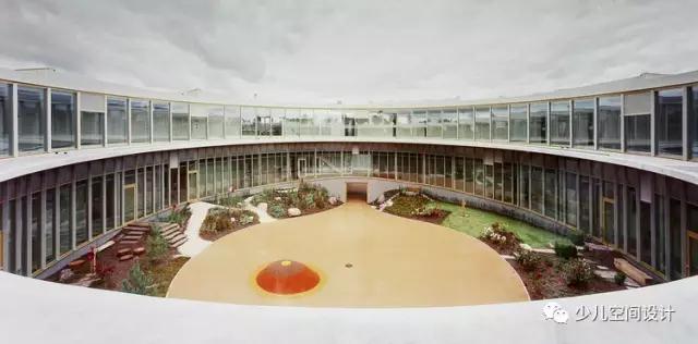 在同一建筑的首層,小圓一般由教室 - 陽臺組成。 他們在最年輕和最年長的學生之間形成一種持續的關系和發展紐帶。從一樓的走廊來看,小孩子的游樂場是開放的場景,以及小孩子們可以看到比他們更大的孩子們所進行的學?;顒?。