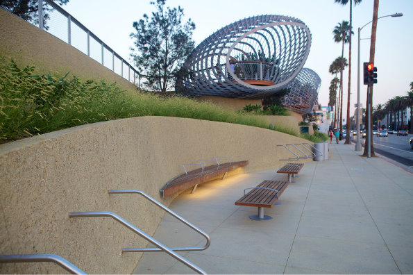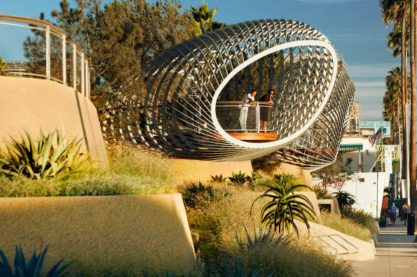 公園內最吸引人注意的是造型新穎的觀景平臺,離地平面約18英尺,曲線型網狀涼亭,就像個編織的橢圓形籃子,民眾可站在原木打造的平臺上,俯瞰一望無際的太平洋丶圣莫尼卡碼頭上的摩天輪與海灘上的熱鬧人群。