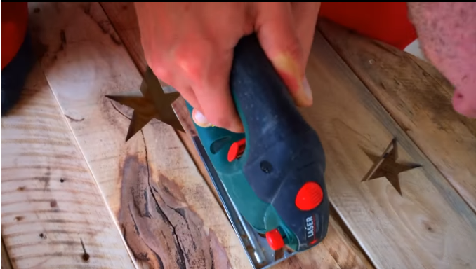 用木板連接起來后,他在上面花了許多小星星,然后切割掉,記住先別扔,收集起來等等還要用。做到上一步這個月亮船就算做好了,接著就是買來壁紙把房間裝飾得更加有童話氣息。