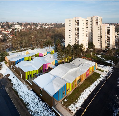 這個(gè)綜合樓由一個(gè)幼兒園、一個(gè)小學(xué)和一個(gè)娛樂(lè)中心組成。建筑內(nèi)的空氣通過(guò)內(nèi)部庭院進(jìn)行流通,這樣孩子們就可以在課間呼吸到新鮮的空氣并且信心滿滿的學(xué)習(xí)。