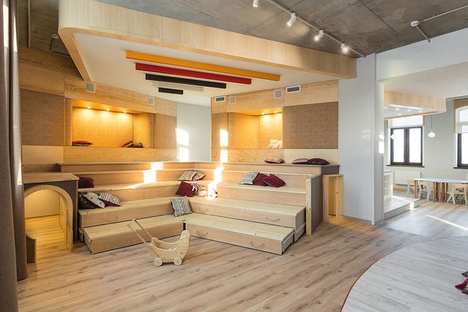 美對發育中的幼兒并非是錦上添花的事,而是喚起幼兒對生活做適當的反應的絕對要素。真的美建立在簡潔上,教室因此無需裝潢得太精巧,不過其內部一切卻必須有良好的設計,并且吸引人,顏色明亮、有朝氣而且協調。室內氣氛必須輕松、溫暖,使幼兒樂在其中。