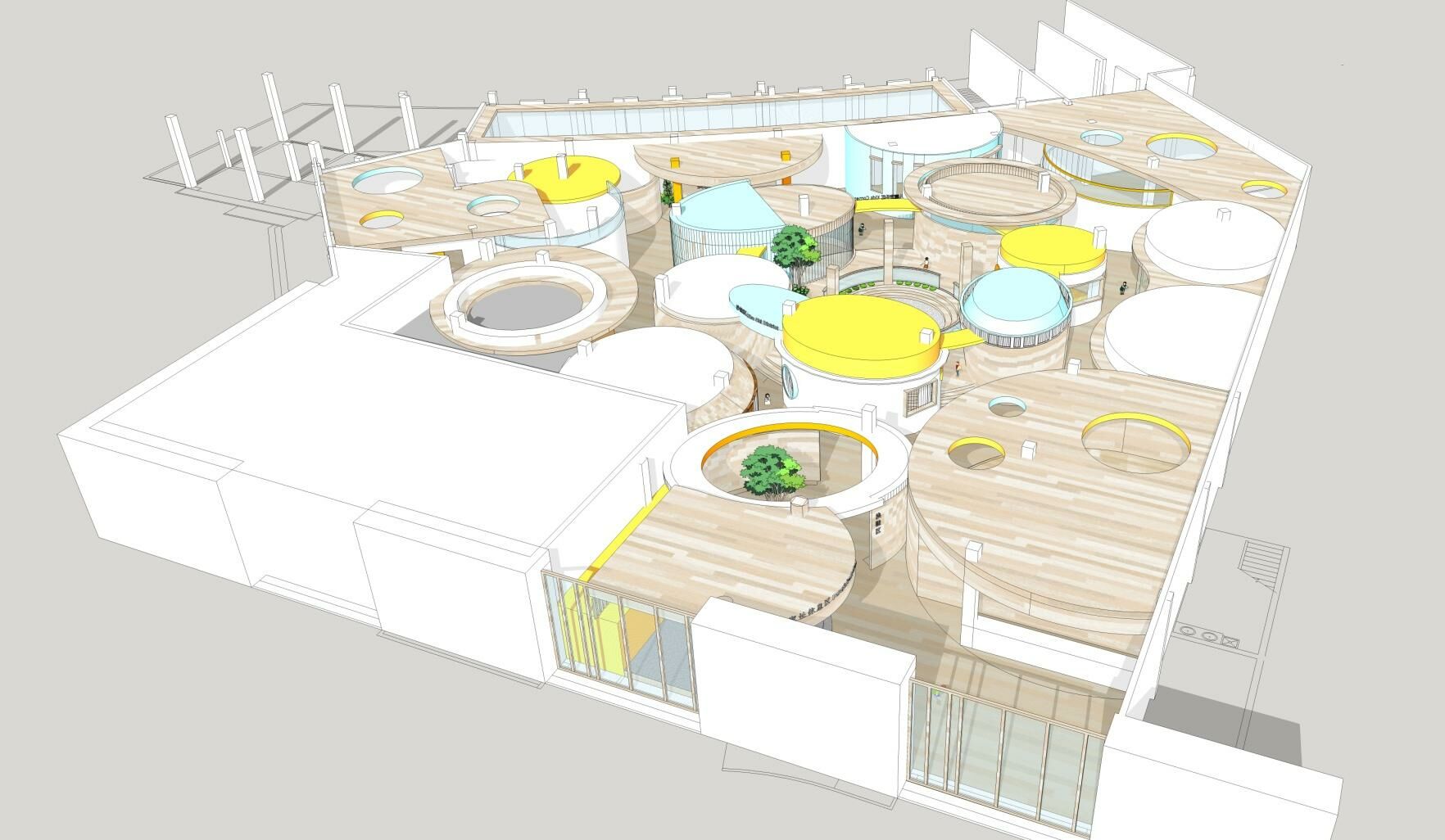 場地總面積有2000㎡,充分的條件讓我們能夠將“城市建筑”這個宏觀的概念和很多設想落地。如果將番趣兒童成長中心看作一座城,我們該怎樣去搭建城市?
