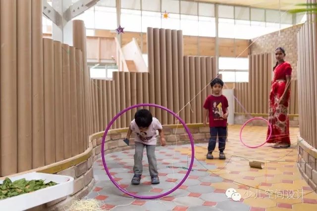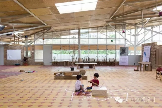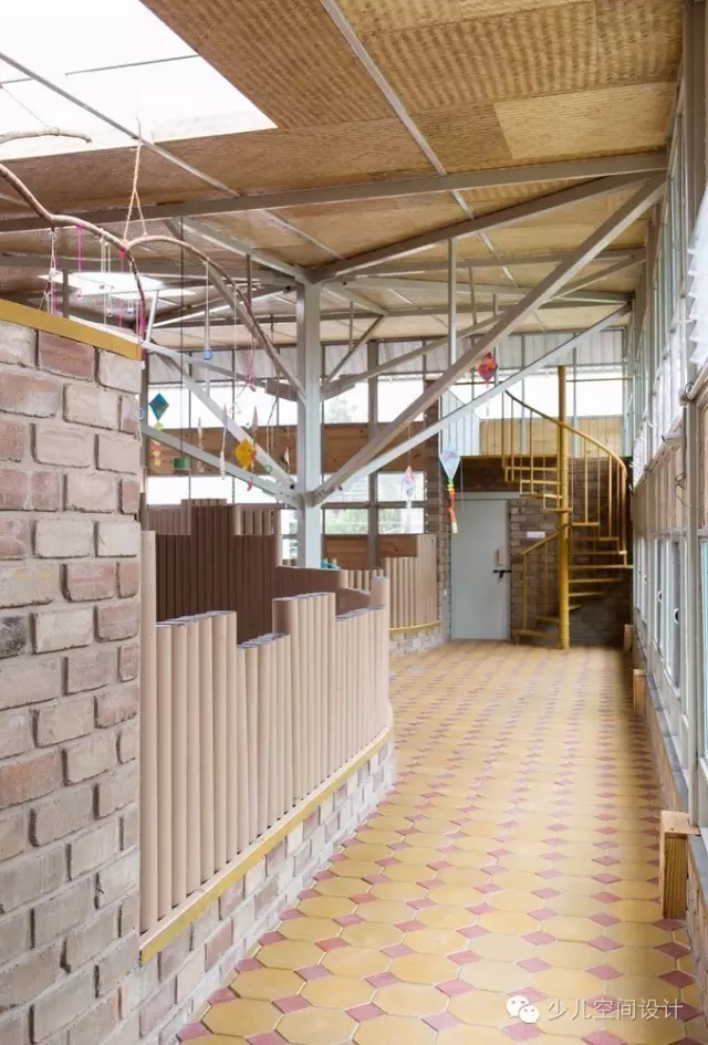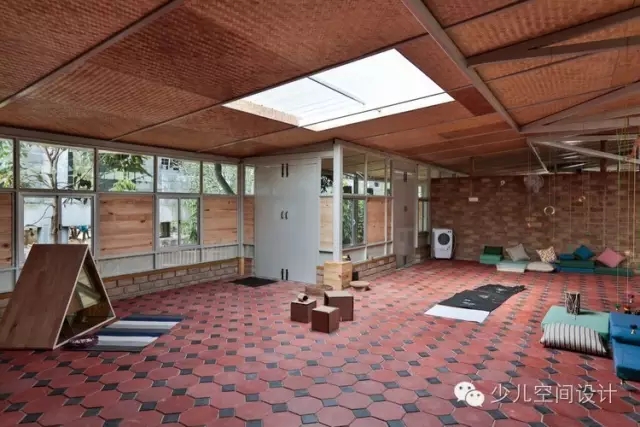 建筑包含4間教室,中心廣場邊上的一間工作室和一間幼兒啟蒙中心的房間與廣場之間有著過度的濾光板。衛(wèi)生間的設(shè)計考慮到了低領(lǐng)人群,小型的尺度不僅適合孩子,還方便監(jiān)護。衛(wèi)生間暴露的排水管與小便墻的設(shè)置能夠被孩子舒適地使用,并易于維護。