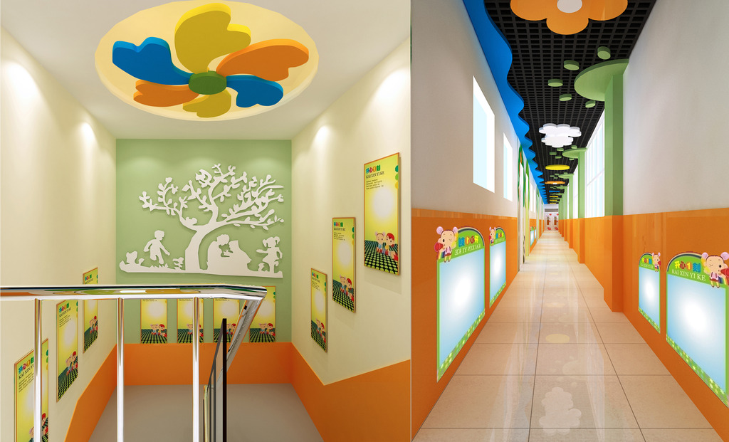 大廳頂部為雙園形黃綠套色吊頂,象征母親與幼兒,月亮與星星;大廳墻面制作一米半高的中孔文化墻,從造型孔中露出背面擺放的金魚缸,自由自在的金魚呈現(xiàn)出幼兒園生機活潑的景象。園的廊墻面布置以抽象畫或抽象作品為主,色調(diào)為黑、白、灰、橙色的搭配為主。走廊頂部安裝網(wǎng)狀鋼網(wǎng),便于吊掛裝飾物。走廊立柱以五彩或橙色為主。(幼兒園室內(nèi)設計)